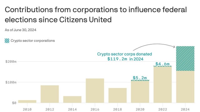 Why it matters: Crypto is pioneering a strategy for direct corporate election spending that could usher in a new era of spending by big companies to get the outcomes they want in elections, the organization argues.