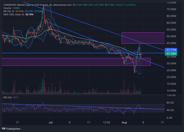 Yesterday we spoke about the recovery of CAW to the purple box that’s been discussed since the 26th. I suggested it would fail to trigger the box and then price would fall back to the high 30s before it headed higher on thurs/or friday. Price got so close to the box though …that I have been debating calling it a hit. Why this matters is that if then 3rd touch of the big trend line running from the peak is triggered on it’s 3rd touch it will be FAR easier to break. Now I typically chart in market share view on DEX screener v USD however you can also chart on price view also versus CRO. This gives us 4 slightly different charts. By slighty different I mean price will be 2-3% off. If we were to look at price v usd chart we do actually trigger the box Price then pulled back to the trend line retest of the 6 week down trend line shown and the 38 fib of the latest move up as shown here . This means that despite a significant pull back later in the day the price action is pretty bullish and pretty soon ill be able to start discussing our next price targets in more detail There is however still some downside risk as BTC looks like it’s struggling to find bullish direction. Proposed strategy DCA, buy dips , be patient Latest CAW News CRONOS ZK upgrade has been delayed until next week. CEXs https://crypto.com/exchange/trade/CAW_USD Socials Icrow with knife website submitted by /u/Nice_Perspective1457 |