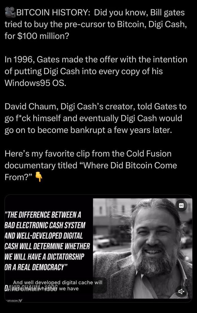 Digicash, a token inspired by the work of Crypto pioneer David Chaum. Without his contributions, bitcoin would not exist as we know it, and we would not be trading memes today.
