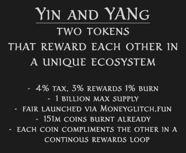 Yin and Yang, one project with two tokens creating an ecosystem of endless rewards between each other. 3% rewards and 1% burnt on every transaction, over 150 million tokens already burnt across the tokens on the first day of launch.