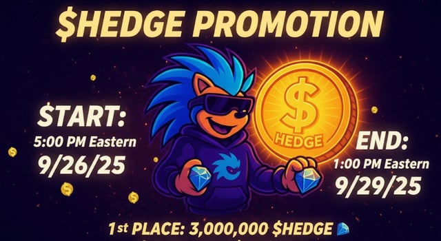 To celebrate these recent milestones $HEDGE is offering an opportunity to win $HEDGE! The top 3 wallets with the most $HEDGE purchased between the snapshot at 5:00 PM EST on 9/26/25 and the snapshot we will take at 1:00 PM EST on 9/29/25 will win: 1st Place – 3 MILLION $HEDGE 2nd Place – 2 MILLION $HEDGE 3rd Place – 1 MILLION $HEDGE Rules & Info: