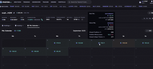Photon rolled out a new feature that makes tracking trading performance way easier which is the P&L Calendar. Here’s what you can do with it Check Any Wallet’s P&L: Not just your own but you can analyze how any wallet performed day by day or week by week. Daily Recaps & Highlights: view of wins/losses without digging through endless transactions. 1-Click Share & Download: Export your P&L calendar instantly if you want to share results or just keep better records. Imo the calendar view makes it much more visual than plain spreadsheets. Being able to see green/red days across a month for any wallet feels like a big upgrade for both research and self-tracking. submitted by /u/divdoofy |