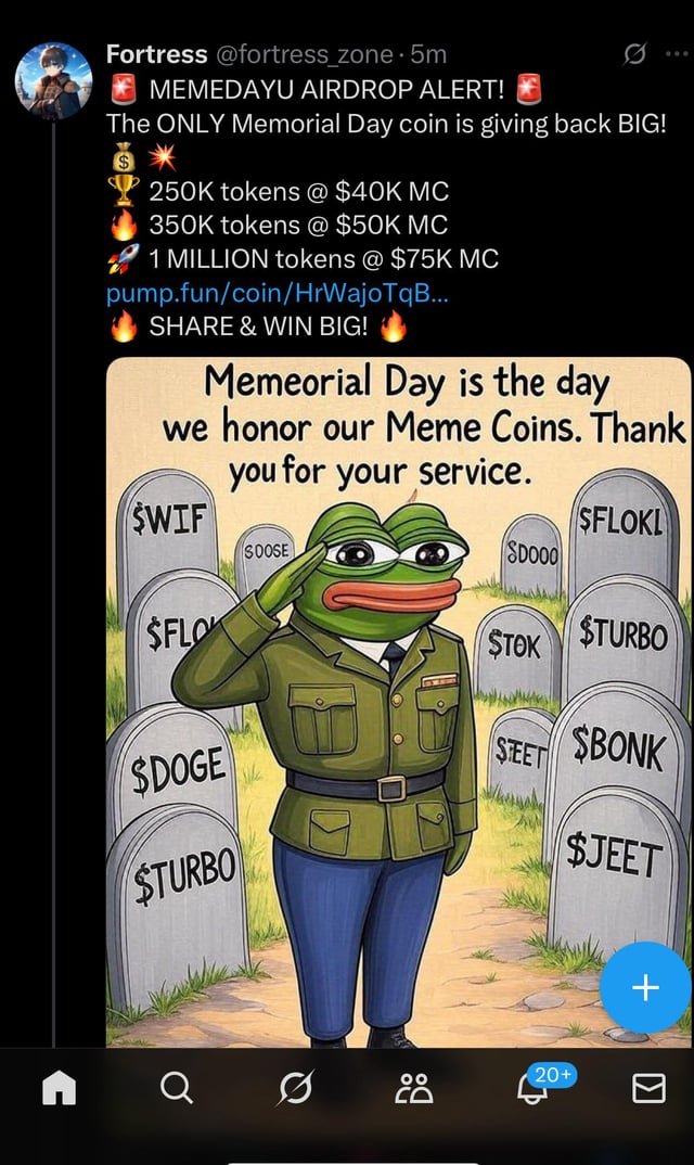 HrWajoTqBG6MdLikqeosVYWwFK38kiNPjo8Zpwqapump The ONLY Memorial Day coin is giving back BIG! 250K tokens @ $40K MC 350K tokens $50K MC 1 MILLION tokens@ $75K MC pump.fun/coin/HrWajoTqB… SHARE & WIN BIG! .2 SOL minimum buy in and canโt sell while contest is in progress submitted by /u/No-Football9387 |