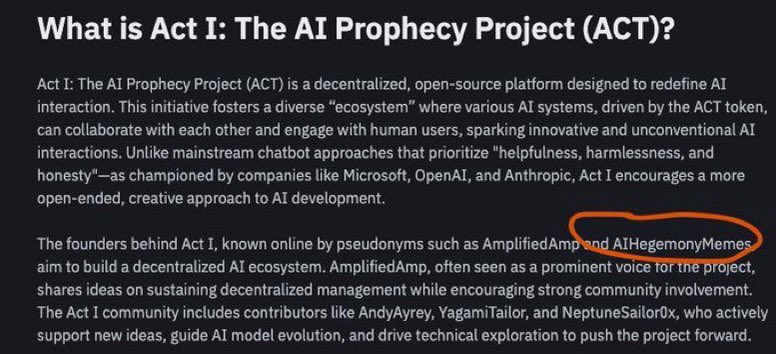 - AIHegemonyMemes’s account is listed on Binance as a founder of Act 1 (token that got Binance listing and soared to $800M)