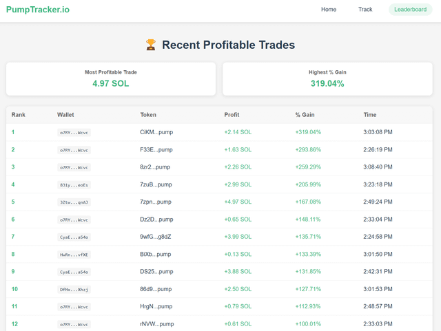 I’m a full-time software developer and spent the last few months getting more into crypto and building blockchain tools. My first project was building a wallet tracking bot. I learned a lot from that project, and I then wanted to build a tool myself that others might find useful. I created a wallet tracking web application that lets you track top Solana Pump fun traders in real time. I used a lot of tools I built for my wallet tracking trade bot for this website, and I eventually want to incorporate the two together. The tracking tool is live now and free. I’m not sure if I’m allowed to post links here, so if anyone is interested, please reach out, and I can send it to you. Here’s a link if you want to check it out Pump Tracker submitted by /u/Bummy_Guy |