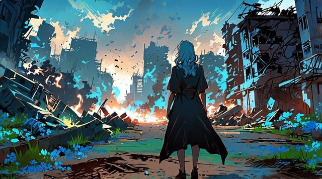 The air was thick, stinging and acrid. The Time Keeper stepped through the shimmering veil of time and into devastation. Her boots crunched on brittle ground, sending up plumes of fine gray dust that hung in the still air like ghosts. Around her, the world was ash and silence. Buildings lay shattered, their skeletal remains reaching skyward like broken fingers. Shadows burned into walls spoke of lives erased in an instant.