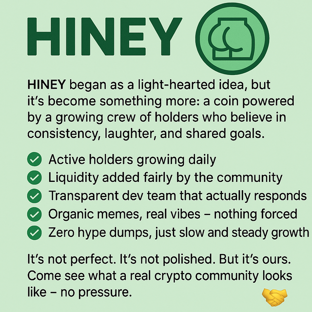 We’re not trying to shill or beg for attention. Just wanted to show what we’ve been building together. HINEY began as a light-hearted idea, but it’s become something more: a coin powered by a growing crew of holders who believe in consistency, laughter, and shared goals. 🟢 Active holders growing daily 🟢 Liquidity added fairly by the community 🟢 Transparent dev team that actually responds 🟢 Organic memes, real vibes nothing forced 🟢 Zero hype dumps, just slow and steady growth It’s not perfect. It’s not polished. But it’s ours. Come see what a real crypto community looks like no pressure. 🤝ahhh Join the #HINEYCoin movement with the #HINEYCommunity as we build a real #CryptoCommunity driven by #Transparency, #Consistency, and #OrganicVibes no hype, just #SlowAndSteady growth powered by active holders and real engagement. It’s more than a meme, it’s a mission. #DeFiWithVibes #NoHypeJustGrowth #MemeCoinWithPurpose #HINEYArmy #RealCryptoCrew #TransparentCrypto #HINEYGang submitted by /u/Helper_kev |