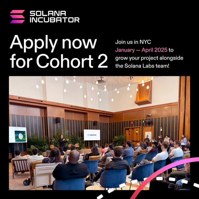 1/ We’re excited to announce applications for the second cohort of the Solana Incubator! Join us in NYC from Jan to Apr 2025 to grow your project alongside the Solana Labs team!